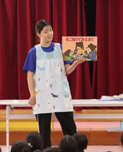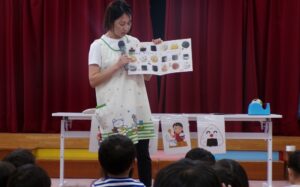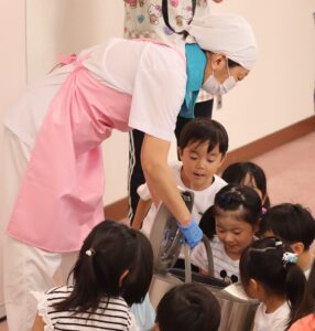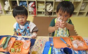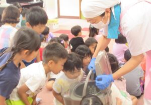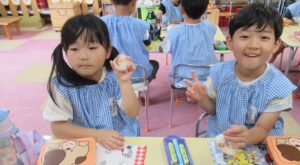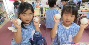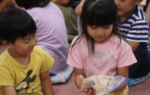 2025.10.01 園日記 おにぎりパーティーを開きました。 9月29日におにぎりパーティーを開きました。 最初にお米ができるまでの紙芝居を見ました。 収穫したお米が籾、玄米、白米となっていく様子を観察しました。 炊飯器の炊きたてのお米を観察。とってもいい匂いです。 各部屋に帰って、一人一人おにぎりを握って食べました。
