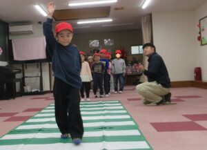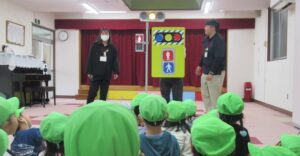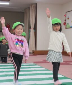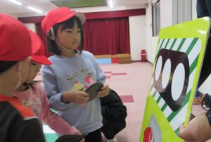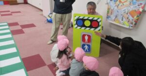 2025.10.29 園日記 第2回交通安全教室を開催しました。 10月24日に第2回交通安全教室を年少~年長園児対象に開催しました。 信号の色はどんな順に並んでいるかな 歩行者用の信号は、どちらかわかるかな? みんなしっかり手をあげて横断歩道を渡ることができます。