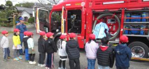 避難訓練の後、消防車の見学をしました。一人一人消防車に乗せていただきました。