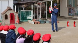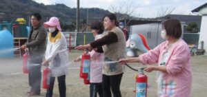 先生が消火器を持って火を消す訓練をみんなで見ました。