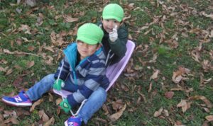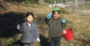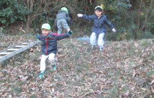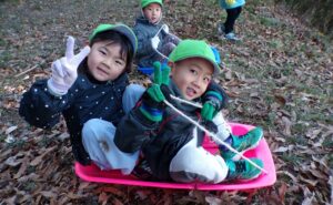 2026.01.24 園日記 すみれ組は森の幼稚園へ 1月15日にすみれ組は、3学期初めての森の幼稚園に行きました。 枯れ葉がたくさん積もってソリの滑り方もスピードアップ 冬とはいえあたたかい日差しの中で楽しく遊びことができました。