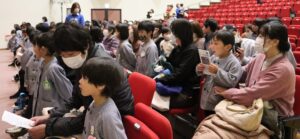 観劇は、天羽地区の小学校、保育所のみなさんも招待して420人ほどで行いました。観劇の前に手遊び歌も・・・