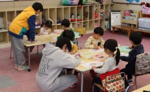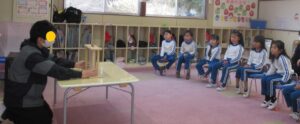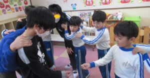 2月6日に天羽小学校6年生が家庭科の授業の一環として、子どもたちと交流活動を計画してくれました。最初は子どもたちと「秘伝ラーメン体操」を行いました。
