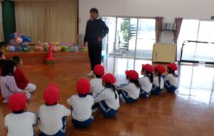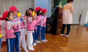 2026.02.19 園日記 ばら組は、サッカー教室に参加しました。 2月16日にばら組の子どもたちは、中央保育所でのサッカー教室に参加しました。 中央保育所の子どもたちとともにコーチの話を聞く子どもたち。 おなかを上にして、手と足を使って歩きます。 2組に分かれて試合を楽しみました。