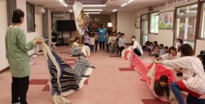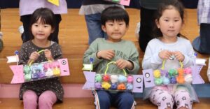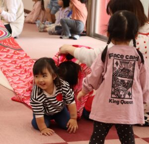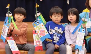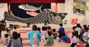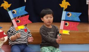2026.04.27 園日記 鯉のぼり集会 4月27日、誕生会の後に鯉のぼり集会を行いました。最初に各クラスで作った作品をみんなの前で披露しました。 ひよこ組 たんぽぽ組 すみれ組 ばら組 大きな鯉のぼりが登場しました。 みんなで鯉のぼりの中をくぐって遊びました。